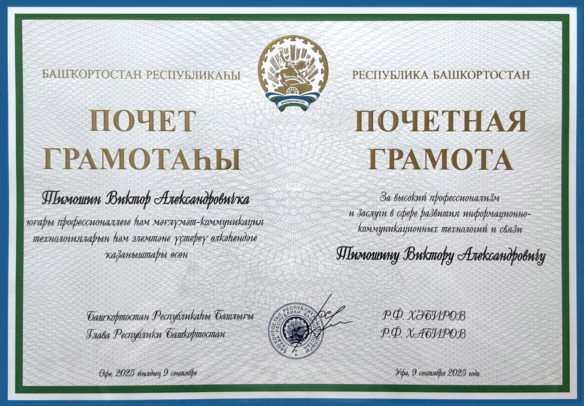 Благодарственное письмо от Главы Республики Радия Хабирова